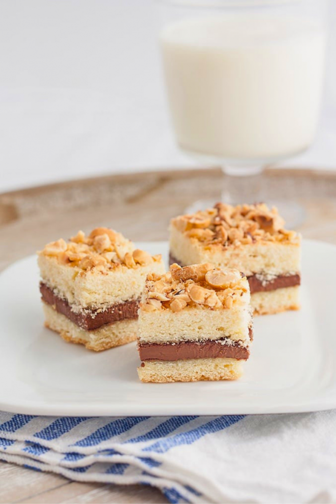 - Spennellare la superficie del dolce con del latte, poi cospargerlo con le nocciole tritate. Cuocere in forno caldo per ca. 40 minuti. Sfornare e lasciare raffreddare, poi tagliare il dolce a quadrotti per ottenere i biscotti ripieni.