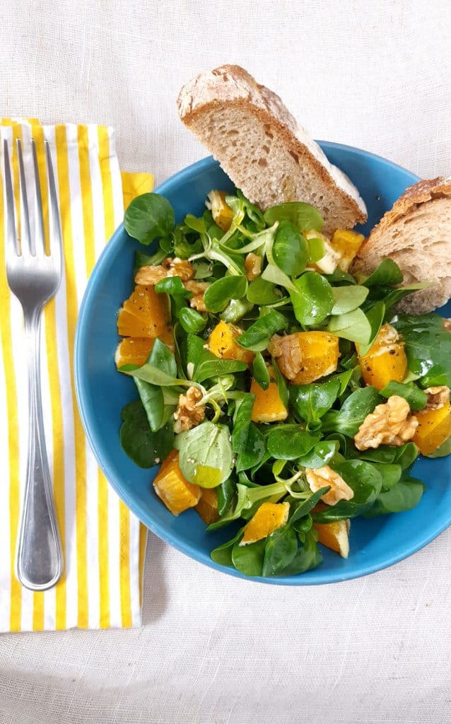 Die Salatsorte (Valerianella locusta), die ich in diesem Rezept verwende, wird bereits seit der Antike angebaut. Sie ist sehr verbreitet und wird heute überwiegend im Gewächshaus kultiviert, weshalb du sie das ganze Jahr über im Supermarkt findest. Feldsalat ist leicht verdaulich und wird jung geerntet. Er sollte nicht mit Valeriana officinalis verwechselt werden, die für ihre beruhigende Wirkung bekannt ist.